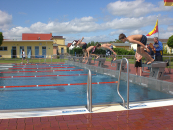 Jugendsportspielen im Malchiner Freibad um die Wette. Nach der Eröffnung durch den Bürgermeister der Stadt Malchin Herrn Lange begannen die Wettkämpfe in den Einzeldisziplinen. Die Wettkampfklasse 5-7 ging über 25m Brust und Kraulen an den Start; die Aktiven der oberen Klassen über 50m Brust und Kraulen. Es gab viele spannende Läufe und am Ende entschied die Zeit über die Vergabe der Medaillen. Wie schon im vergangenen Jahr waren die Aktiven der Marcusschule sehr erfolgreich. Höhepunkt des Tages waren zweifellos die Schwimmstaffeln, die sowohl in der Wettkampfklasse 5/6 als auch in der Wettkampfklasse 7-10 von den Marcusschule gewonnen wurden. Alle Teilnehmer waren mit Begeisterung dabei. Ein großes Dankeschön haben sich die Organisatoren der Veranstaltung, der Kreissportbund und das Freibadteam, verdient. |