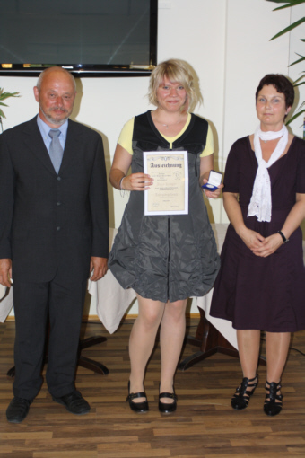 werden. Sie zeigt natürlich ein Porträt von Siegfried Marcus. Die erste ihrer Art wurde nun auf der Zeugnisausgabe der 10.Klassen des Jahrgangs 2009/2010 an die Jahrgangsbeste Schülerin Julia Krüger aus der Klasse 10a verliehen. Sie erreichte ein Gesamtprädikat von 1,4 und wurde durch das Vorstandsmitglied Frau Brumund und den Vereinsvorsitzenden Herrn Süssig mit der „Siegfried Marcus“ Ehrenmedaille ausgezeichnet. Voller Stolz nahm Julia Krüger die Auszeichnung entgegen. Diese Medaille zu bekommen war für Julia eine zusätzliche Motivation bei den geleisteten Abschlussprüfungen, diese mit bestmöglichen Ergebnissen zu bestehen. Und mit Erfolg wie man sehen kann, herzlichen Glückwunsch. |