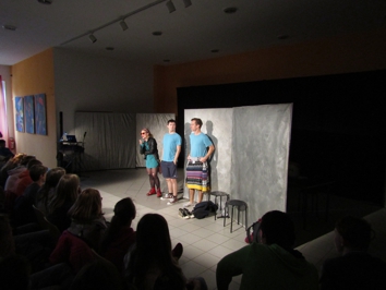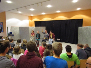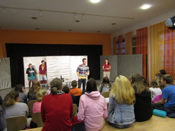 Am Montag, den 17.Oktober, sahen die Klassenstufen 7 und 8 in der 3. und 4. Stunde das Theaterstück „Philotes“. In dem Stück ging es um einen Jungen der spielsüchtig war und deswegen seine Freunde und seine Aufgaben vernachlässigte. Die Spielgruppe heißt ,, Theater Spiel“. Es gab vier Schauspieler. Einer verkörperte den spielsüchtigen Jungen namens Benny. Ein zweiter spielte den Freund von Benny und hieß Tom. Eine dritte spielte ein neues Mädchen in der Klasse und hieß Larissa und eine vierte verkörperte die Mutter von Benny. Benny war nicht gut in Deutsch. Als er ein Referat halten musste, war eine Vorbereitung nicht möglich, weil er das Computerspiel ,, Philotes“ gespielt hatte. Nachmittags hatte Benny sich mit seinem Kumpel Tom zum Tischtennis verabredet, aber auch dafür fand er zunehmend keine Zeit mehr. Er hatte nur mit seinem Spiel zu tun. Benny wurde seinen Freunden und seiner Mutter gegenüber immer aggressiver. Wir fanden das Theaterstück sehr interessant und lehrreich. Das Ende gefiel uns nicht so gut, da das Ende offen blieb. Das Stück war insgesamt sehr spannend und jedem wurde sehr bewusst gemacht, wie schlimm Spielsucht werden kann. (Sophia und Jessy, K8b) |