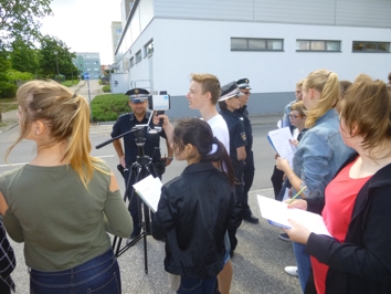 (A.Süssig) Die Siegfried-Marcus Schule liegt an einer Landesstraße. Gegenüber der Schule wurde vor einiger Zeit ein Supermarkt eröffnet. Schüler der Schule überqueren in den Pausen die gefährliche Landesstraße, um sich Essen zu holen. Da die Pausen recht kurz sind, beobachten viele Schüler den laufenden Verkehr sehr flüchtig. Die Malchiner Stadtvertretung und die Schulleitung haben sich seit einiger Zeit darum bemüht, hier eine Reduzierung der Fahrgeschwindigkeit zu erreichen. Nach mehreren erfolglosen Versuchen ist es seit einigen Wochen doch umgesetzt worden. Vom Klassenraum war zu beobachten, dass sich nur wenige Kraftfahrer an die Geschwindigkeit von 30 km/h halten. Zum großen Teil fahren sie routinemäßig und haben die neuen Verkehrszeichen gar nicht wahrgenommen. Dies war Anlass, um im Rahmen unseres Projektes die Polizei zu bitten, hier eine Kontrollmaßnahme durchzuführen. Am 31.05.2017 wart es dann so weit. Die Schüler überprüften gemeinsam mit den Beamten die Einhaltung der Geschwindigkeit. Nachdem uns erklärt wurde, wie das Lasermessgerät funktioniert und was man bei einer Kontrolle alles beachten muss, durften wir selbst ans Gerät. Einige Fahrer haben uns von weitem entdeckt und abgebremst, viele jedoch waren zu schnell. Kraftfahrer, die es besonders eilig hatten, wurden rausgezogen. Sie hatten heute Glück, dass es bei einer Ermahnung blieb. Im Interesse unserer Sicherheit, sollten sich in Zukunft alle Fahrer an die Geschwindigkeitsbegrenzung halten. Knapp eine halbe Stunde haben wir gemessen. Leider gibt unsere Übersicht kein vollständiges Bild, da es uns bei einer Reihe von Fahrzeugen nicht gelungen ist, eine korrekte Messung vorzunehmen. Wir mussten feststellen, dass das Zielen auf das gewünschte Fahrzeug gar nicht so einfach ist. Es war eine ganz tolle Stunde. |