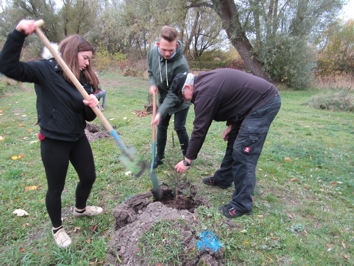 Unternehmens Isolierung und Verschäumung Swienty in Aktion. Chauffiert wurden wir von unserem Hausmeister Herrn Thiel. Das Auto stellte der Stadtbauhof. Bei stürmischen und kalten Wetter mussten wir uns erstmal warm arbeiten. Da kamen 24 Fichten gerade recht. Zügig war die Arbeit durch 8 fleißige Schüler des Schuldienstes unter Begleitung von Herrn Teggatz getan. Sicherlich lag es auch daran, dass durch die Firma Swienty alles super vorbereitet worden war und Herr Hühnerjäger uns tatkräftig unterstützte. Blumenerde, Spaten, Wasserbehälter, Gießkannen sowie ein Radlader waren vor Ort und die Arbeit ging gut von der Hand. Durchgefroren, aber glücklich und zufrieden, fuhren wir zur Schule zurück. Jetzt hoffen wir, dass „unser Wald“ weiter wächst. |