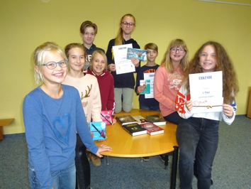 | (U.Braun) Die Marcusschüler haben eine neue Lesekönigin, denn Vorweihnachtszeit ist an der Schule Lesezeit. Insgesamt 8 Kandidaten aus den drei 6. Klassen stellten kürzlich in der Stadtbibliothek ihr Können unter Beweis. Zur Jury gehörten neben Lehrern auch Schüler der Klasse 8a. Beim Vorlesen der unbekannten Texte lieferten sich alle ein Kopf-an-Kopf-Rennen. Insbesondere die vielfältige Buchauswahl trug dazu bei, dass für ausreichend Spannung sowie gute Unterhaltung gesorgt war. Selbstverständlich war zu Beginn der zweiten Runde die Anspannung noch einmal besonders groß. Die Schüler lasen aus dem Kinderbuch ,,Enno Anders“ von A. Frank, ein Mutmacherbuch für Kinder ohne Gymnasialempfehlung. Auf dem Siegertreppchen der Jubiläumsrunde konnte letztlich Paula S. aus der 6a ihre Urkunde entgegennehmen. Sie wird die Schule beim nächsthöheren Entscheid 2019 vertreten. |